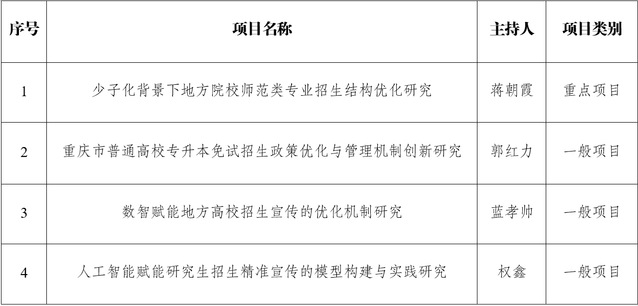 根据《重庆市教育委员会关于做好2026年度重庆市高等教育考试招生研究课题项目申报工作的通知》要求,经个人申报、部门初审、专家评审等程序,现将我校拟推荐申报的项目名单予以公示(具体名单附后)。
